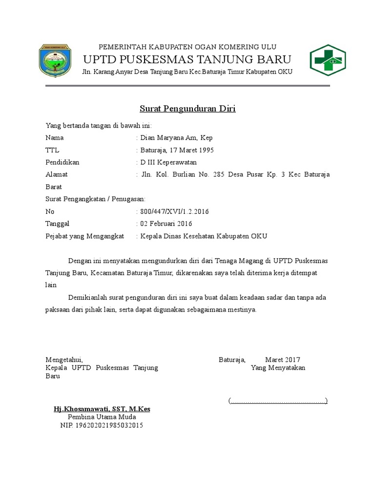 Surat Pengunduran Diri Di Puskesmas / Dokter Umum di Puskesmas Burau Mengundurkan Diri, Ini ... : Berikut contoh surat pengunduran diri dari kerjaan dengan alasan melanjutkan studi.
